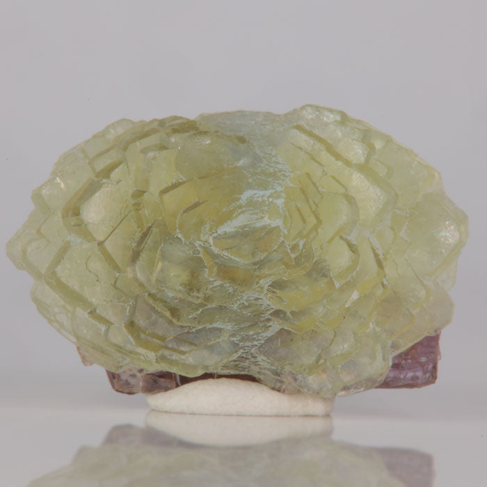 Beautiful yellowish-green prehnite flower formed on top of a tanzanite at one point. Now left is only a small portion of the rough tanzanite, but the stunning formation of the prehnite flower is the main focus of this piece.This beautiful mineral specimen is very aesthetically pleasing with detailed crystal formation. We consider this piece to be a Thumbnail (TN) sized specimen.