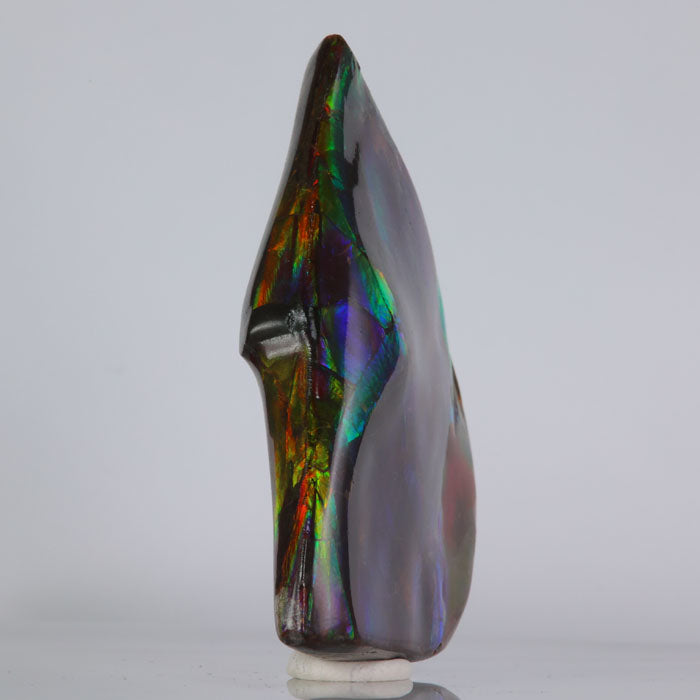 This naturally bright & colorful specimen is a fragment of a full ammolite fossil. Stabilizing and polishing these specimens is typical from this source. This double-sided piece has a beautiful color range on both sides. It's a slim and cool looking piece! It's a great piece!