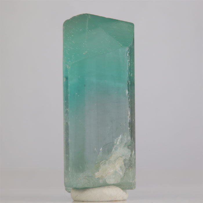 This very cool spodumene crystal has a bluish-green color at the termination and goes almost colorless towards the base of the crystal. While it is an interesting color, I am almost certain it has been treated to enhance the color. That said, this is a collector piece for someone who is aware of this and is looking for a specimen to show this type of color in spodumene. I am uncertain of the colors stability and it is very possible that it may fade over time. All that said, it is a very nice piece with good aesthetics. We consider this to be a Thumbnail (TN) sized specimen.