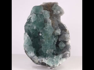 This beautiful Chinese greenish fluorite shows very well and has a very appealing orientation to it. The cubic fluorite is stacked on top of each other up through the middle of the specimen. On one side of the fluorite is a greyish layer of drusy quartz crystals. We consider this piece to be a Extra Large Cabinet Specimen (XLC).