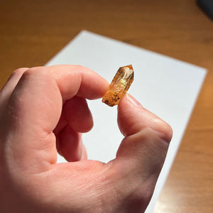 This chrome topaz crystal has a beautiful & gemmy yellowish Orange color. While beautiful in natural lighting, these chrome topaz crystals have the unique characteristic of fluorescence and will fluoresce a beautiful pinkish/red color when viewed in a dark room under a long wave UV flashlight. The last photo is an example of a group of Zambian chrome topaz crystals (this particular piece is shown somewhere in this group shot) displayed under natural light and under a long wave UV lamp to show the fluorescence seen in this material. *Keep in mind, some crystals will have a stronger fluorescence than others.We consider this piece to be a Thumbnail sized Specimen (TN).
