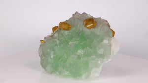 This beautiful green fluorite has gemmy orange barite crystals that was grown on top of it. These together give a cool contrast and this specimen displays wonderfully. We consider this piece to be a Small Cabinet (SMC) Sized specimen.