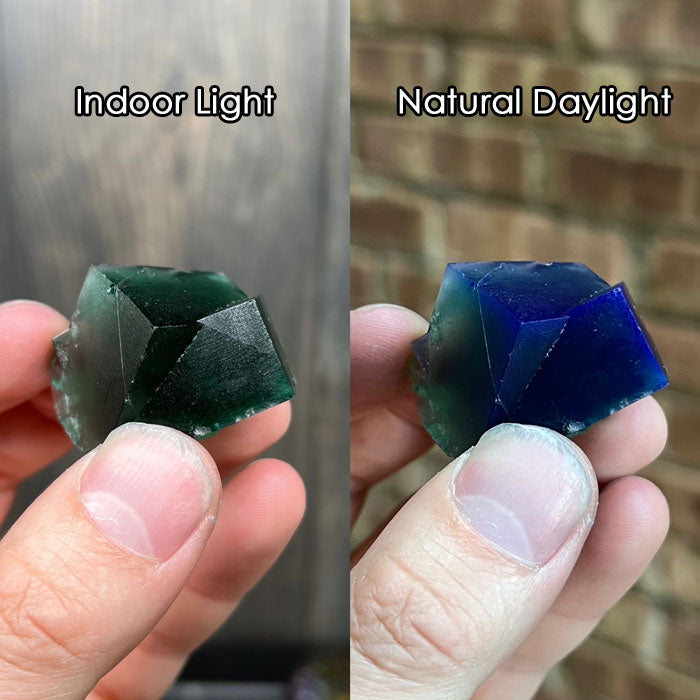 This gorgeous piece of fluorite was found at the famous Rogerley Fluorite mine in England. It displays the beautiful daylight fluorescent characteristic of Green in indoor lighting to a deep blue green in daylight. This piece is very gemmy, has deep color, and has great crystal structure. You can see in the photos the intense daylight fluorescence outside (deep blue towards the outer edges of the fluorite crystals) and another photo in normal indoor lighting it is a stunning deep green. We consider this piece to be a Thumbnail Sized Specimen (TN).