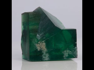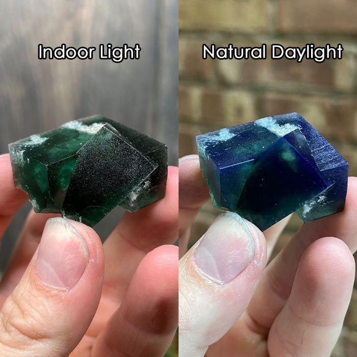 This gorgeous piece of fluorite was found at the famous Rogerley Fluorite mine in England. It displays the beautiful daylight fluorescent characteristic of Green in indoor lighting to a deep blue green in daylight. This piece is very gemmy, has deep color, and has great crystal structure. You can see in the photos the intense daylight fluorescence outside (deep blue towards the outer edges of the fluorite crystals) and another photo in normal indoor lighting it is a stunning deep green. We consider this piece to be a Thumbnail Sized Specimen (TN).