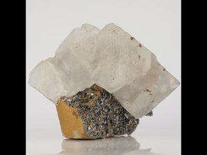 Beautiful clear fluorite crystal specimen has a stack of fluorite crystals sitting on top of another crystal with Arsenopyrite. We consider this piece to be a Small Cabinet Specimen (SMC). This beautiful mineral specimen is available today!