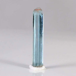 This aquamarine crystal has a beautiful gemmy blue color with a unique termination. A beautiful piece. We consider this piece to be a Thumbnail sized Specimen (TN).