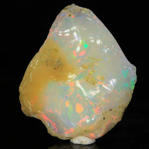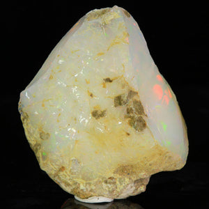 Big Beautiful white base Rough Welo Ethiopian hydrophane opal mineral specimen with a beautiful play of color. This piece is very fine cutting/carving material that should have a good yield. It has intense red flash, with slightly less intense color play of many colors. This can cut an outstanding opal. We recommend that this opal material NOT be submerged in water (unless it is being cut, water will keep it cool), and it should never have any oils applied to it. Also, due to the hydrophane nature of this opal, the weight can vary slightly with humidity. We consider this to be a Thumbnail (TN) sized specimen.