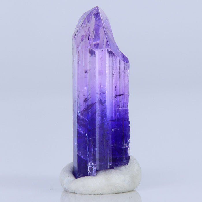This gemmy bi-color tanzanite crystal has much deeper blue color towards the base of they crystal and fades into a very transparent pinkish purple at the termination. A beautiful specimen. Watch the video to see a high resolution 360° view of this specimen.