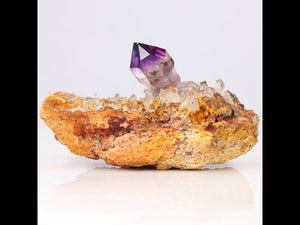 This piece is an amazing specimen with great color and beautiful termination. The amethyst crystal sits towards the center of the piece. We consider this piece to be a Miniature Specimen (MIN).